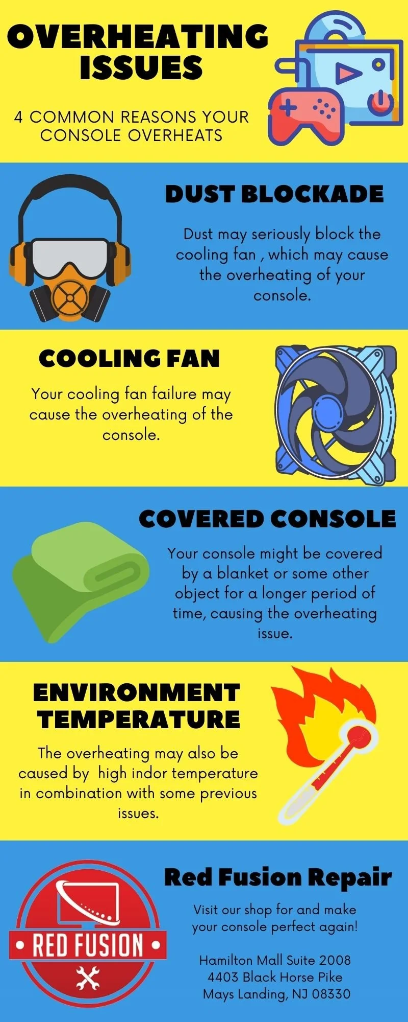 Playstation or Xbox overheating problems are quite common. If you're a typical gamer, you've probably encountered this problem before, but it will most likely happen again. Aside from the frustration, overheating can seriously damage your console's circuit boards. That is why you should perform a monthly check-up on your console to prevent these issues from recurring. The most common overheating console issues are represented in the infographic provided by Red Fusion Repair Shop.